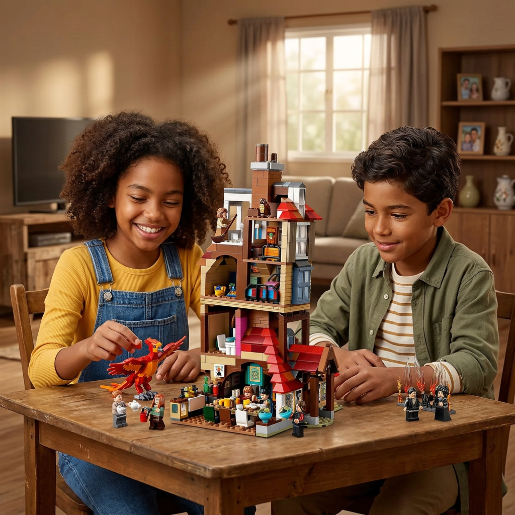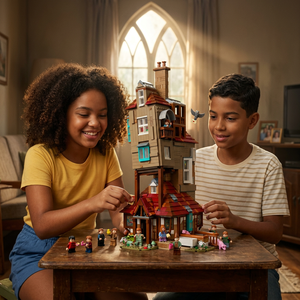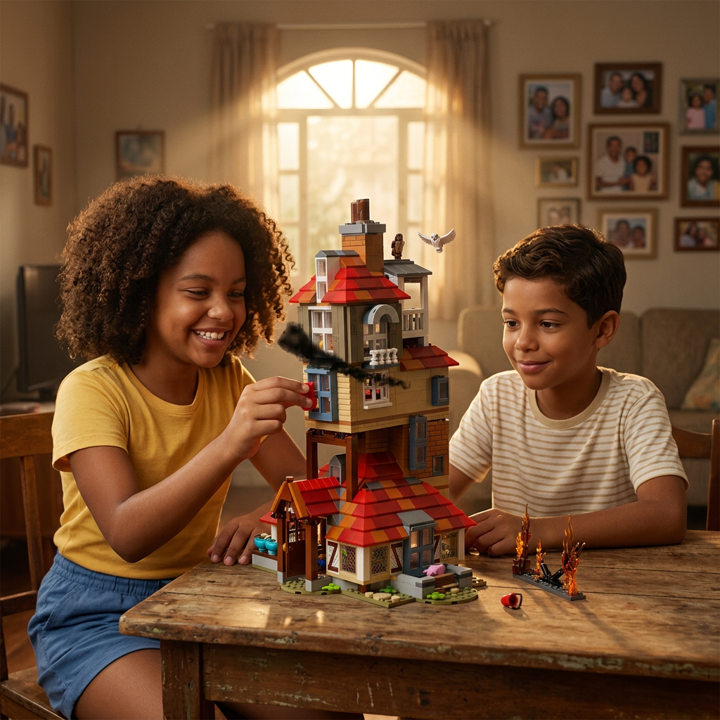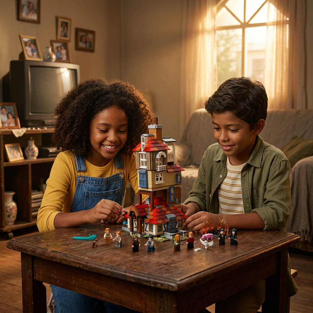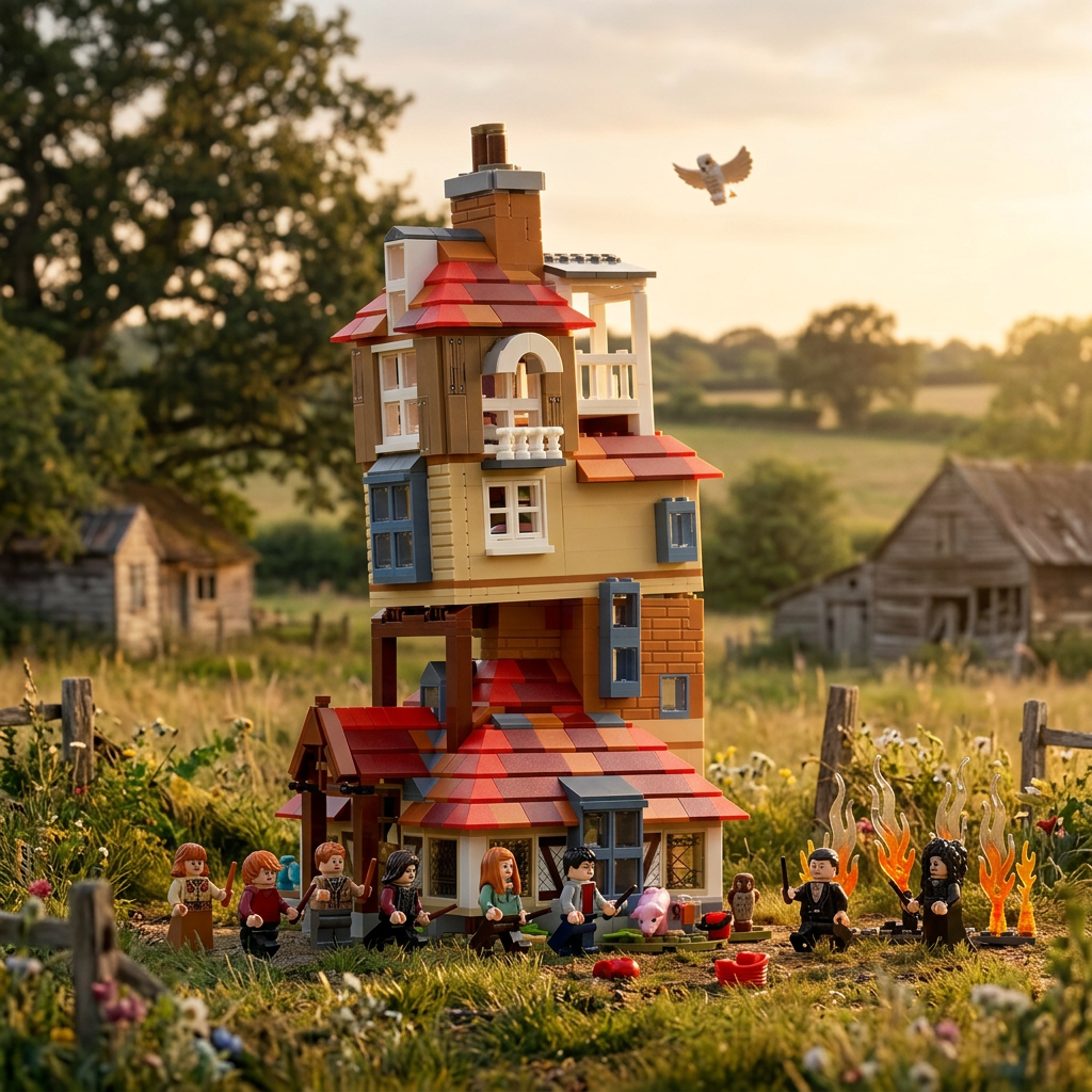 São 10 minifiguras incluídas: toda a família Weasley reunida, com Harry Potter e a coruja Edwiges completando o elenco. 🏚️✨