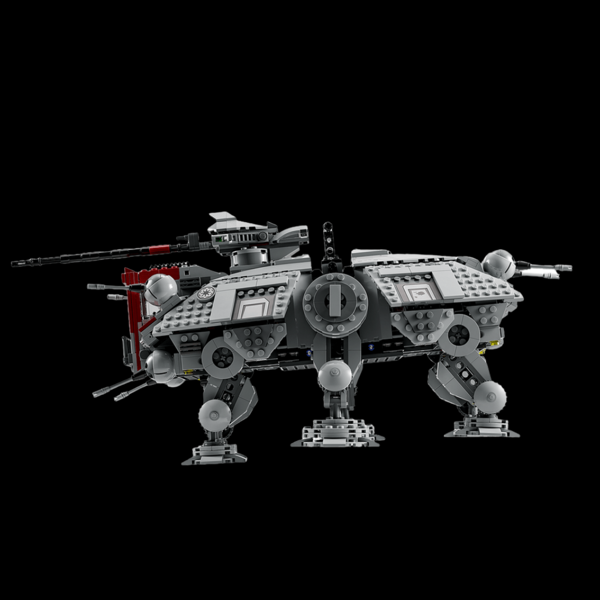 Este modelo de 1082 peças recria com fidelidade o veículo de assalto mais reconhecível das Guerras Clônicas: pernas ajustáveis que replicam a marcha pesada e determinada do Walker, canhão principal com rotação de 360° e dois disparadores laterais prontos para o combate.