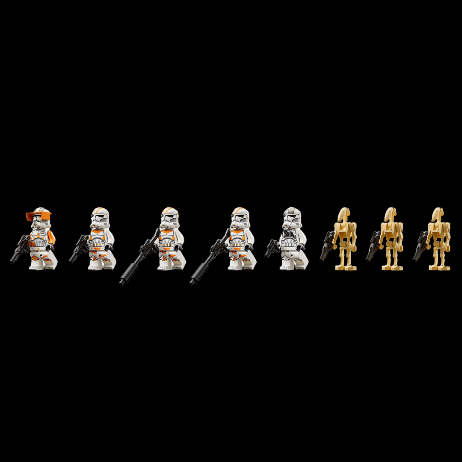 🪖 Minifiguras: Comandante Cody, Atirador Clone da 212ª, 3 Clone Troopers da 212ª, 3 Droides de Batalha e 1 Droid Aranha Anão