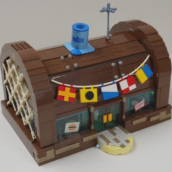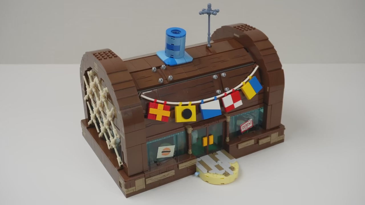 Com 2.700 peças, este set recria em blocos o lendário restaurante Krusty Krab, cenário clássico de Bob Esponja e palco das aventuras mais divertidas da Fenda do Biquíni.