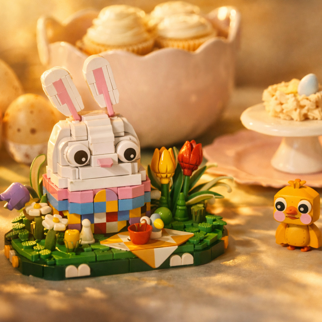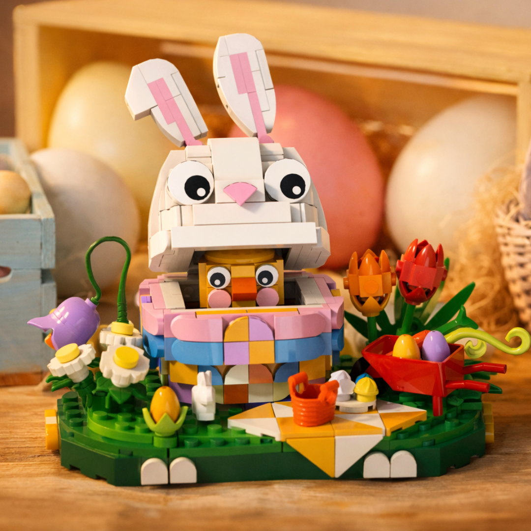 É uma celebração sensorial da estação mais florida do ano, onde cada uma das 400 peças em plástico ABS eco-friendly se transforma em pétalas vibrantes, cenouras alaranjadas e orelhas expressivas que capturam a essência lúdica deste símbolo pascal.