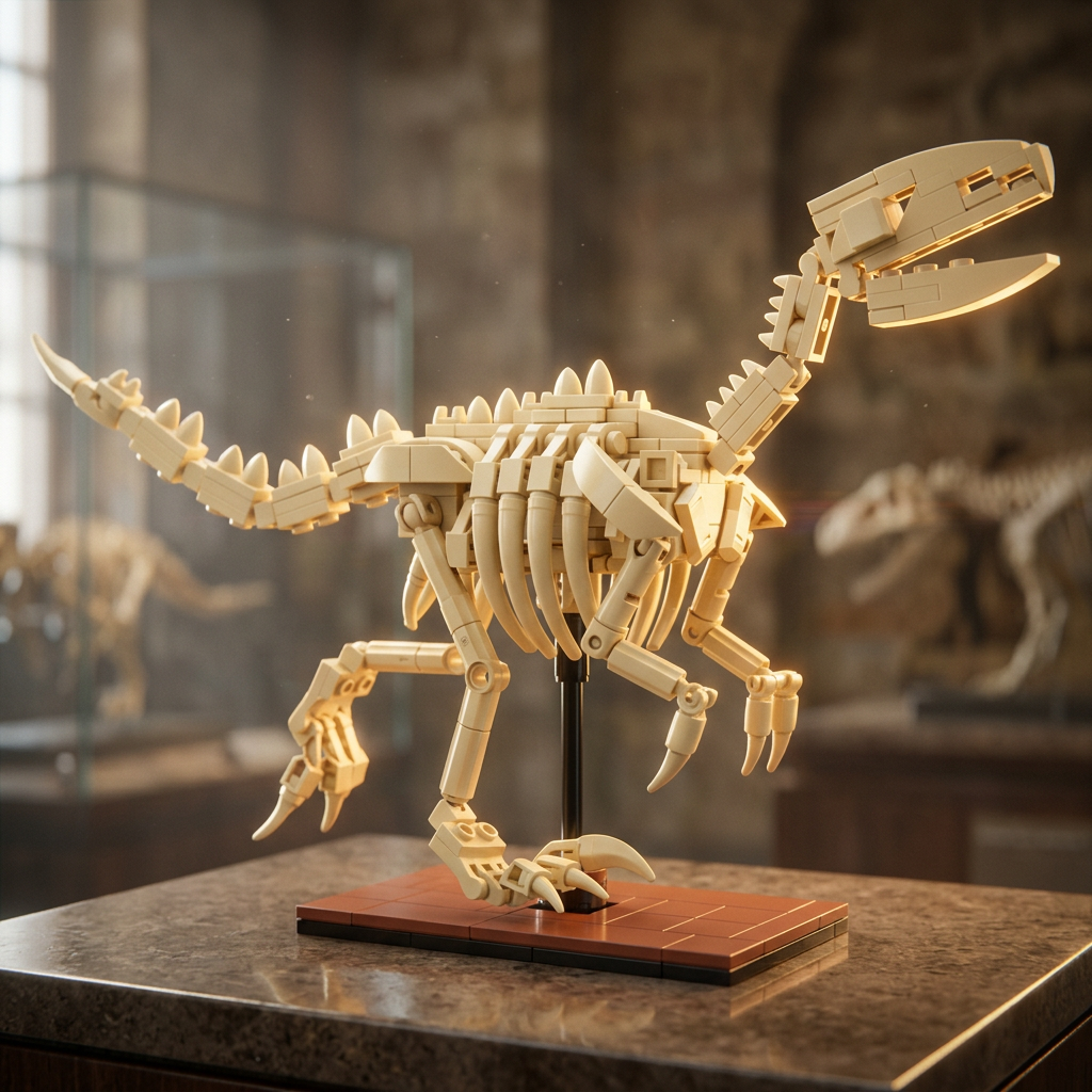 Este conjunto reúne os três ícones da paleontologia em 825 peças de blocos de construção com um detalhe que nenhum museu oferece: todas as peças ósseas são fabricadas com material luminescente especial que absorve luz e brilha intensamente no escuro, transformando cada modelo em uma peça de exibição viva mesmo depois que as luzes se apagam.