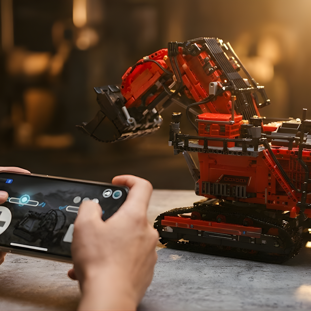É uma aula de física e mecânica em forma de blocos, replicando os sistemas hidráulicos e a robustez da máquina real.