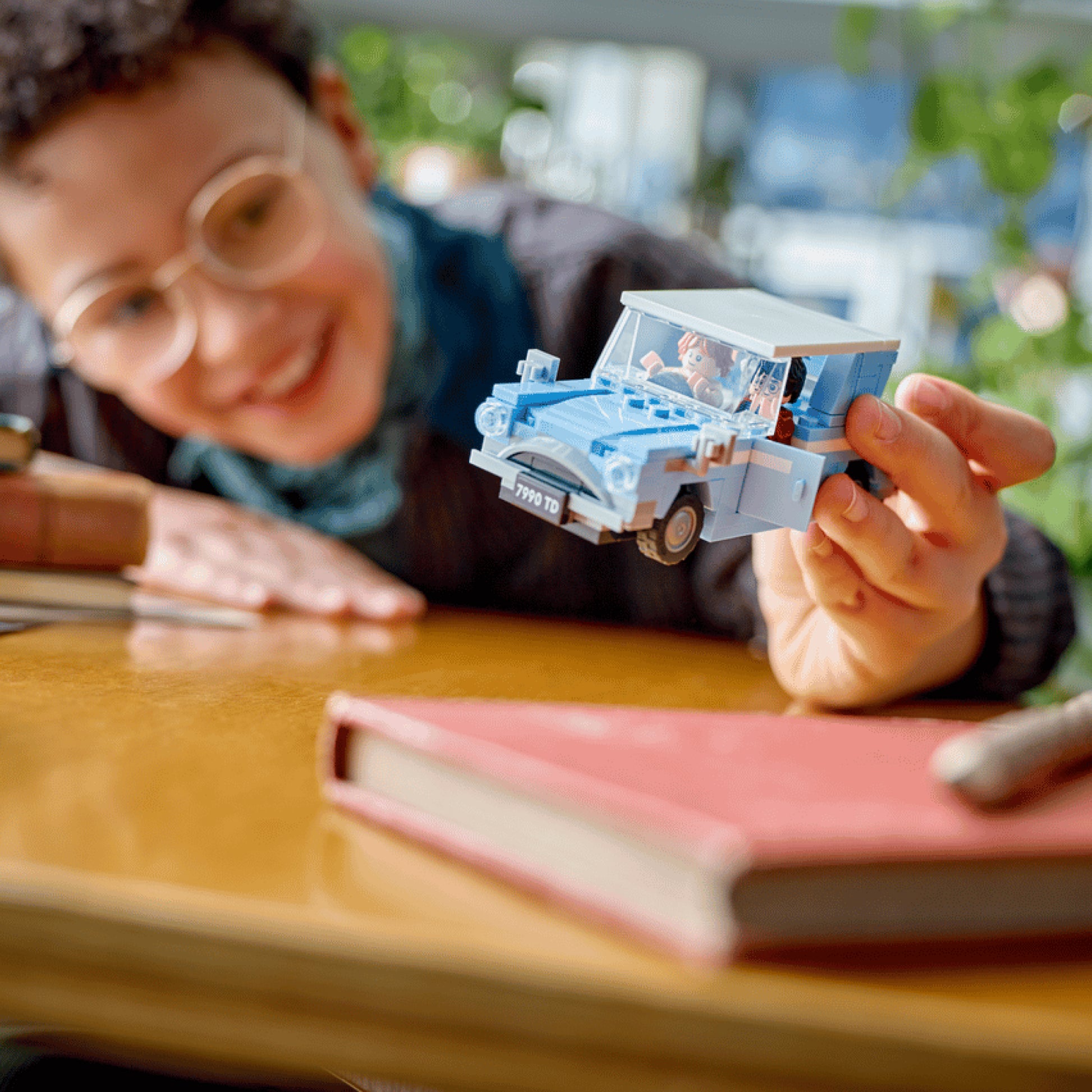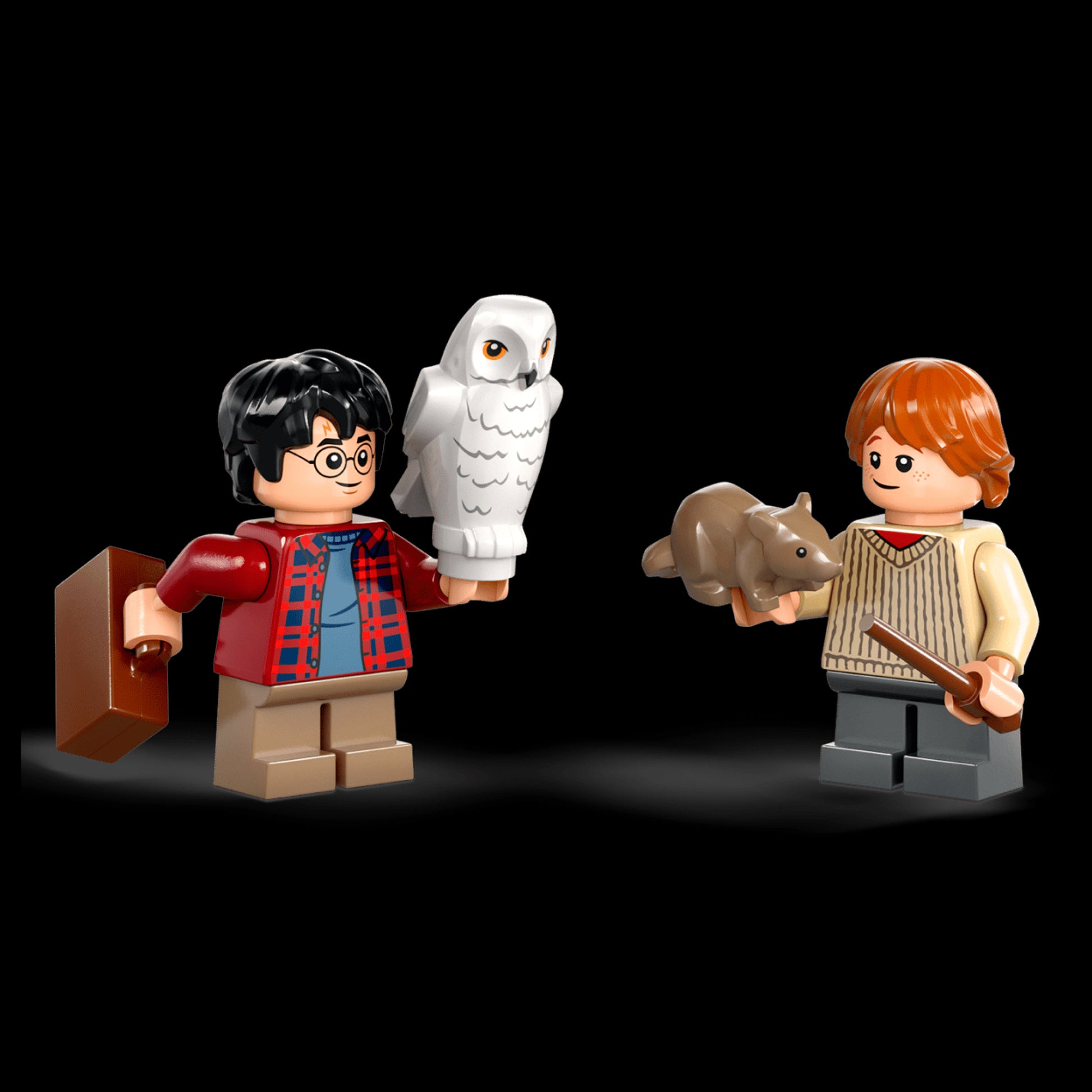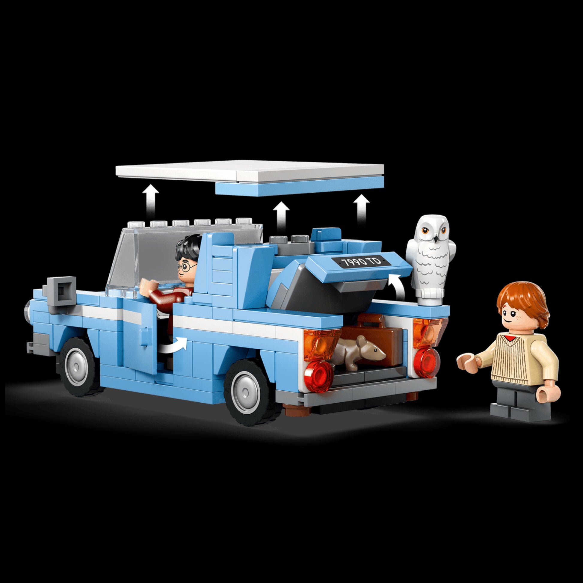 A minifigura de Hedwig pousa no banco traseiro, enquanto Scabbers completa o elenco deste momento inesquecível. 🚗✨
