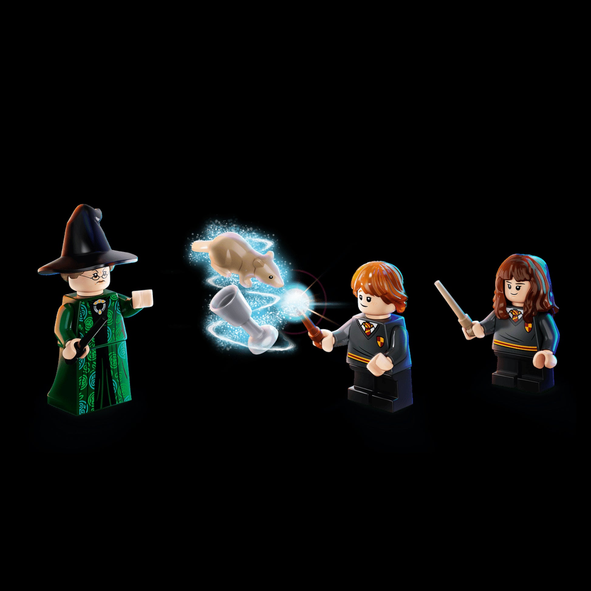 Com 241 peças, este set recria a sala de Transfiguração num formato de livro mágico que se abre para revelar o cenário completo: mesas, cadeiras, quadro-negro com anotações e os detalhes que os fãs reconhecem de imediato.