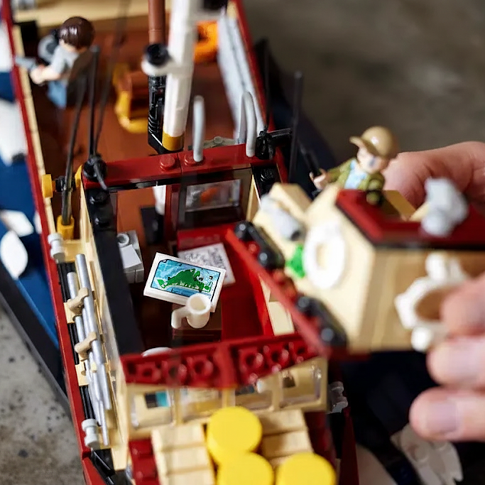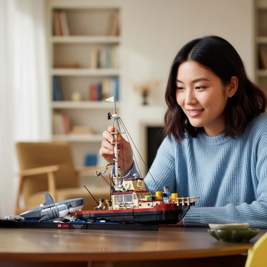 O Conjunto do Filme "Tubarão" tem 1497 peças, e recria cenas icônicas do clássico filme de Steven Spielberg, permitindo aos fãs reviver momentos memoráveis.