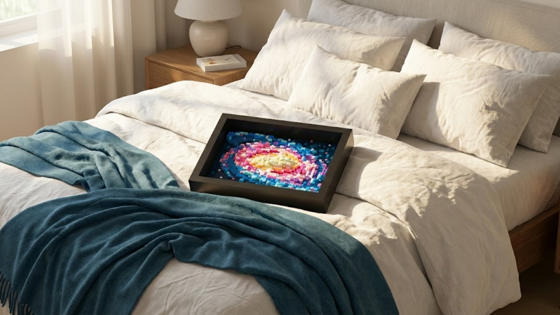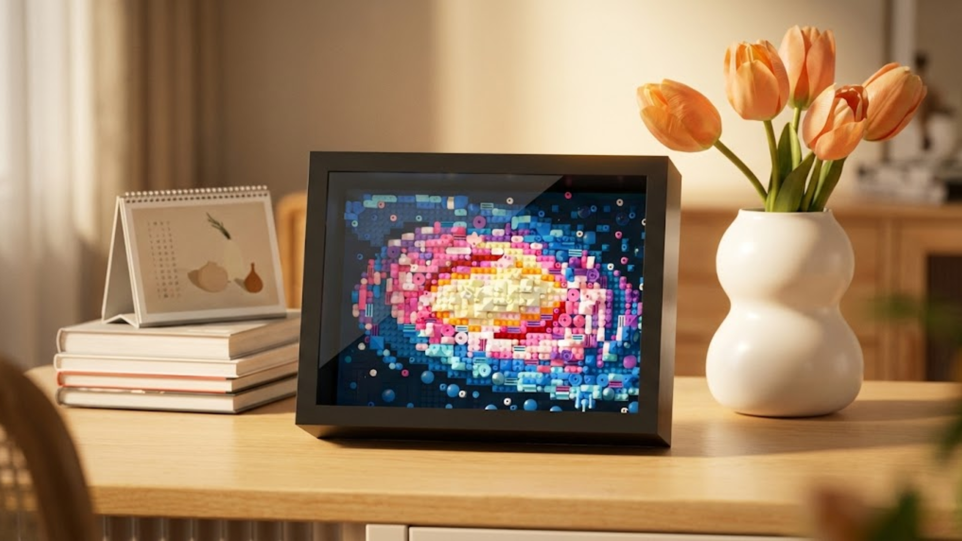 Nebulosa Vibrante: As micro peças coloridas são dispostas para simular o gás e a poeira estelar, criando um visual hipnótico que muda conforme a iluminação do ambiente.