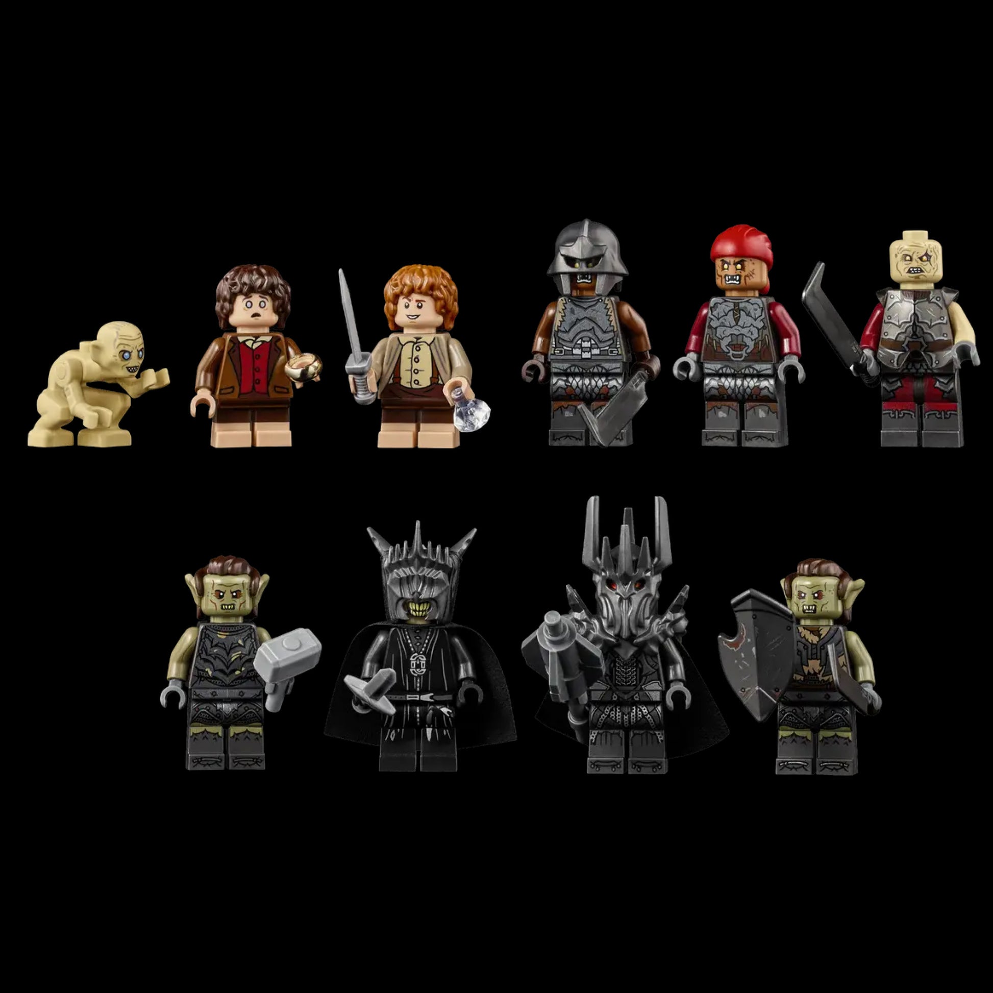 👥 10 minifiguras exclusivas: Sauron, Gollum, Frodo, Sam, Boca de Sauron, Orcs e outros personagens icônicos